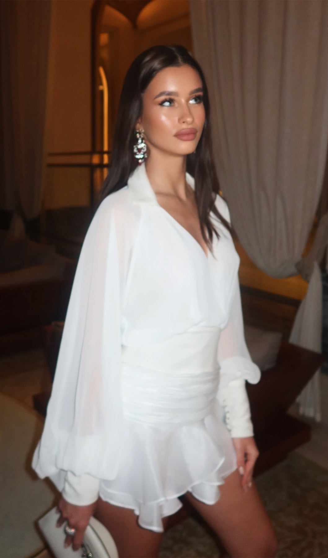 The Angelina Lantern Sleeve Mini Dress is a wardrobe essential for those who appreciate timeless elegance with a contemporary twist. Effortlessly elevate your style with this striking piece, ideal for any fashionable occasion.