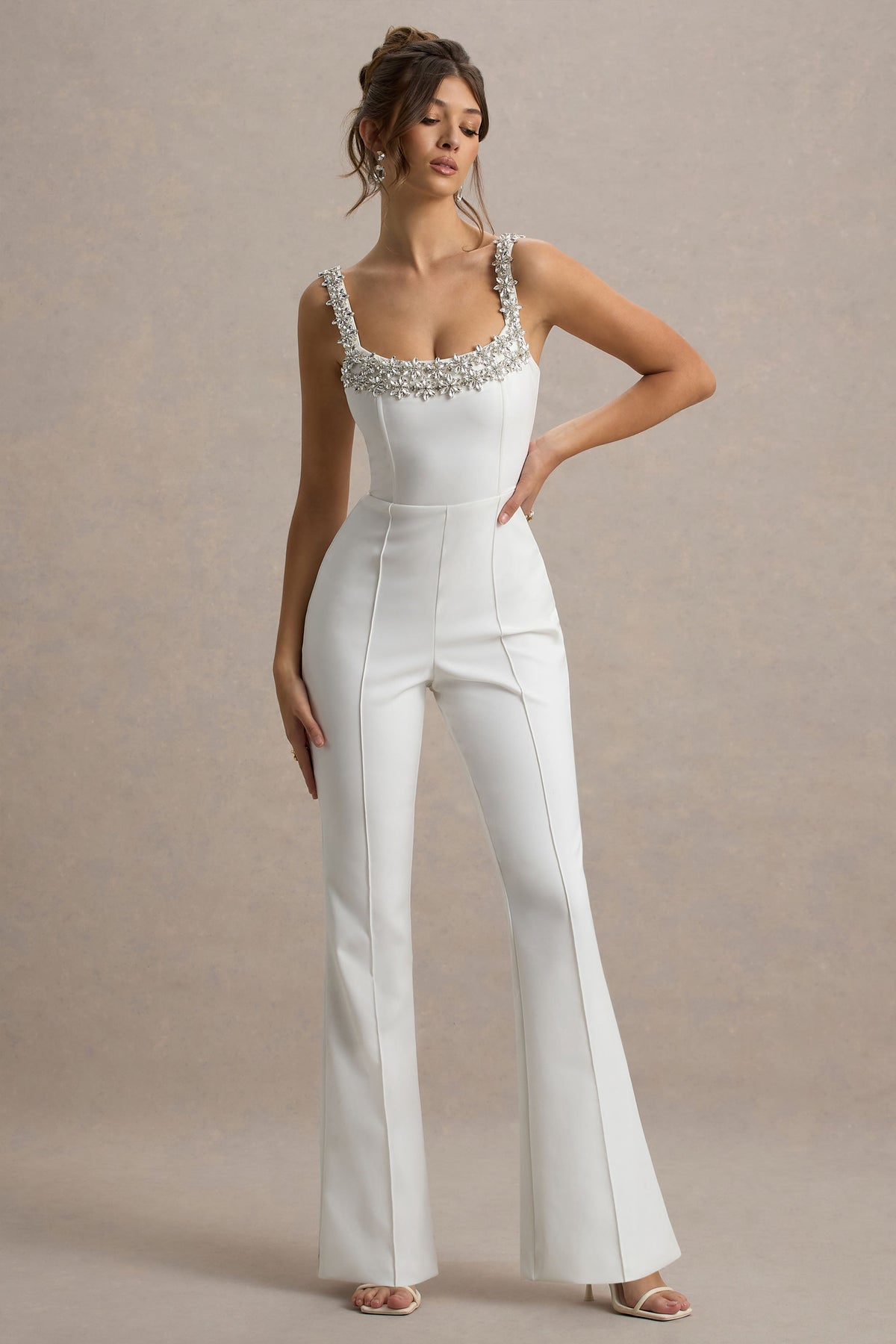 Amadi is a statement-making choice for your next special event. Crafted from our premium crepe, this white strappy jumpsuit features eye-catching embellishments that add a touch of glamour to its sleek silhouette. The fitted bodice beautifully contrasts with the flared-leg design, creating a flattering and elongating effect. Style Amadi with bold accessories and heels to keep this standout piece at the centre of attention at any occasion.