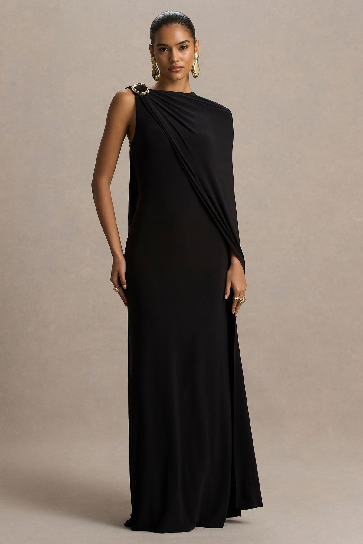 Make every entrance unforgettable in Cressida. Crafted from our premium stretch jersey, in a deep black hue, this maxi gown captivates from all angles. Featuring an asymmetric neckline and a dramatic cape-sleeve for a modern, elegant silhouette. The twist sleeve is accented with a chic gold ring detail at the front shoulder, adding a subtle touch of luxury. Perfect for evenings when you want to feel effortlessly glamorous.