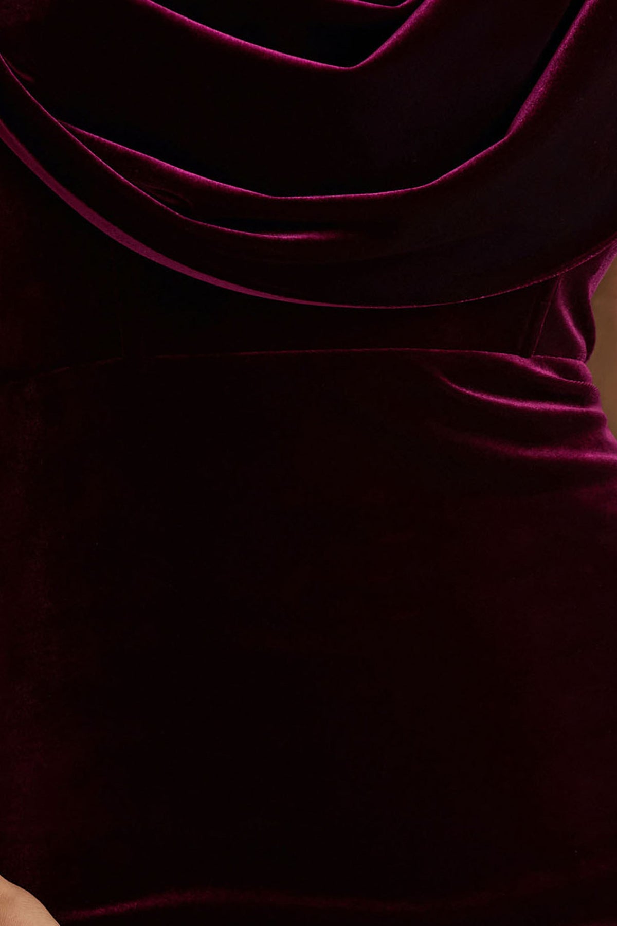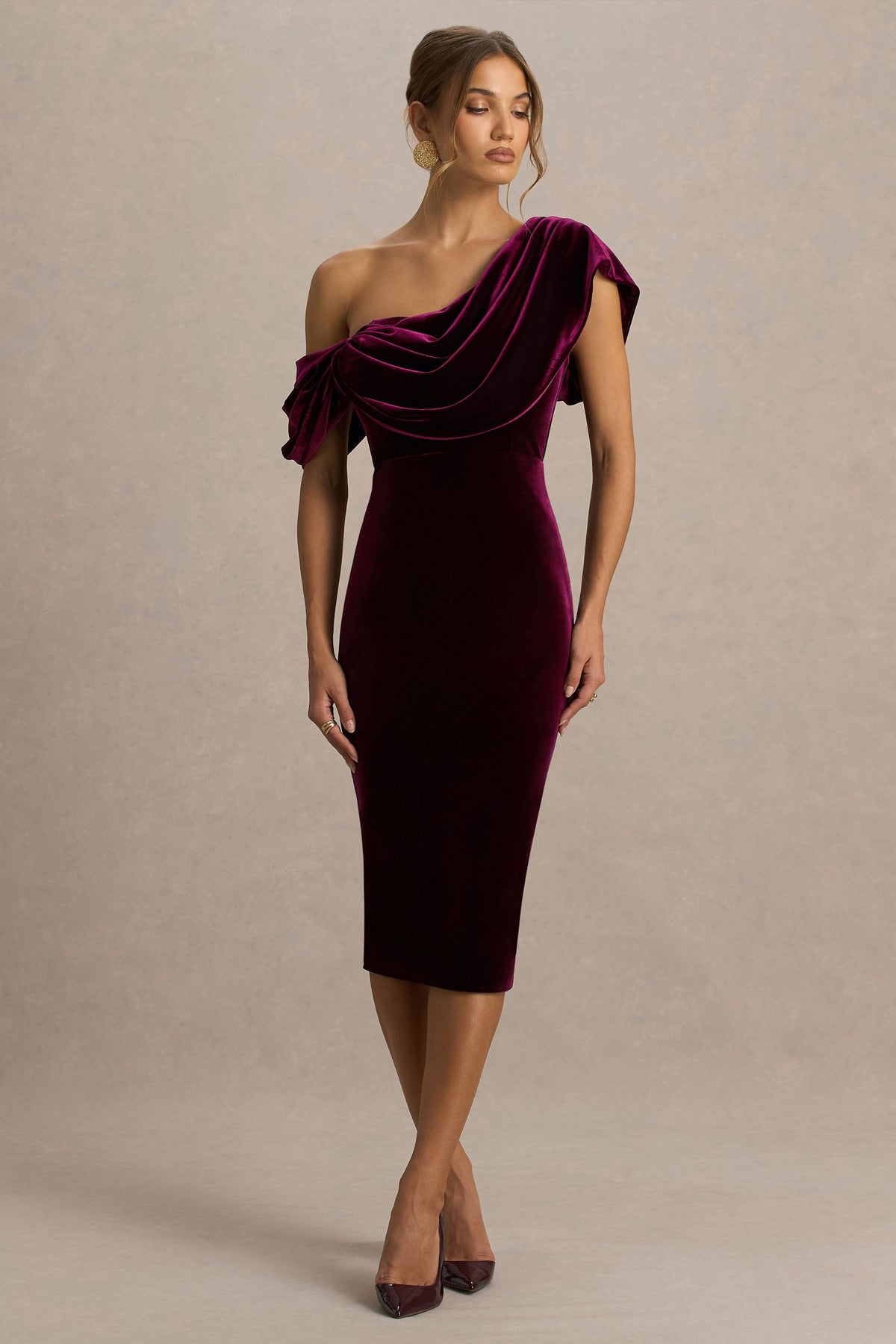 High End | Burgundy Velvet Asymmetric-Neck Midi Dress With Draped Detailing