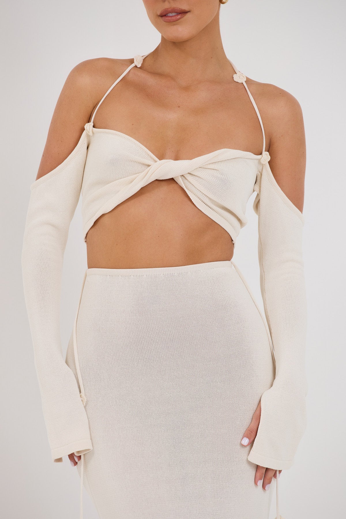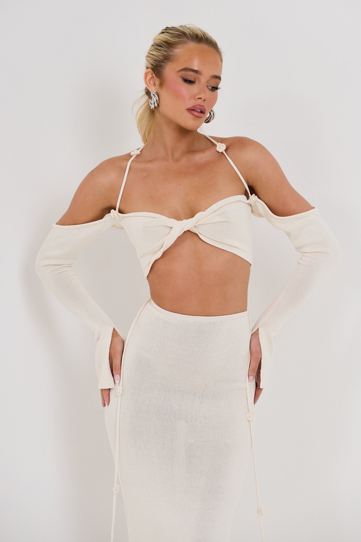 Twisted neckline – adds sculptural detail and soft framing to the bust.